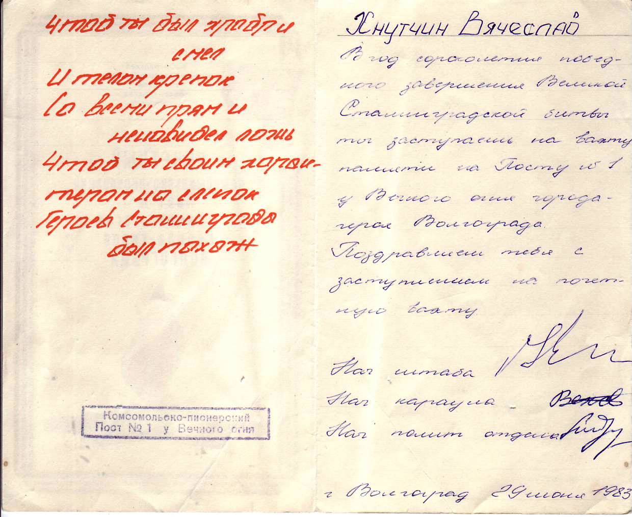 Всегда готов поделиться еюАнатолич писал(а) :Большое спасибо за информацию и ссылку.Печорин писал(а) :Да, существует-всё как на открытке на пред. страницеКонечно, с 9 мая 1973 (второй в СССР ПКП № 1) года был некоторый перерыв, связаный с лихолетьем, но традиции военно-патриотического воспитания в городе всегда были сильны-Пост № 1 отстояли.Недаром бывший руководитель Поста № 1 в г. Пятигорске-Андрей Клименко возглавляет в настоящее время ГУ "Российский центр гражданского и патриотического воспитания детей и молодежи" в Москве
