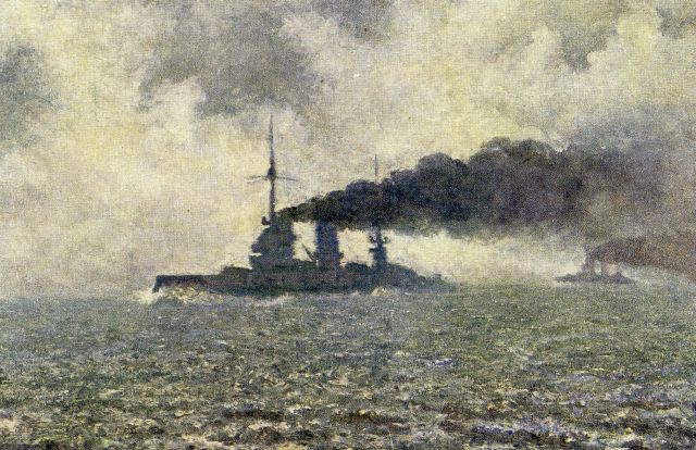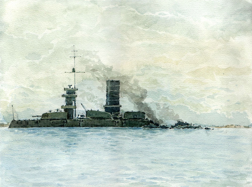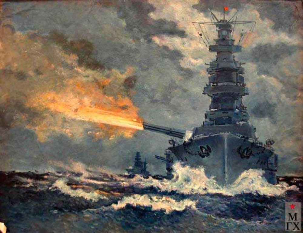 Несамоходную плавучую батарею, созданную из останков уничтоженного линкора, советские художники рисовали не столь охотно. Вот единственная работа на данную тему