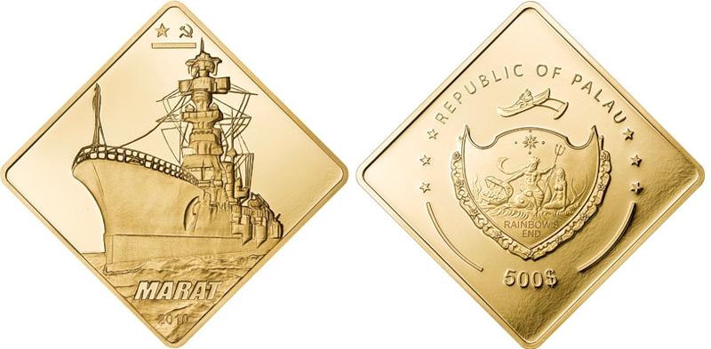 В честь этого легендарного линкора "МАРАТ" ВМФ СССР- республикой Палау в 2010 г.выпущены две ромбовидные монеты.