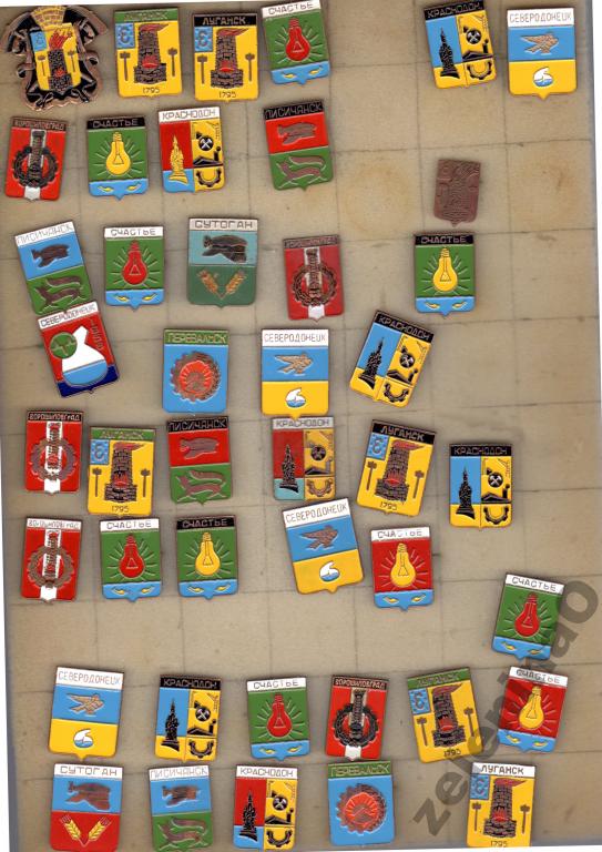 За основу дизайна "герба" Ворошиловграда (первый значок) был взят дизайн советских гербов Киева и Чернигова, утвержденных в 1969 году.