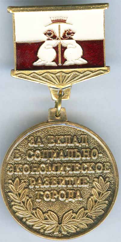 Знак «ЗА ВКЛАД СОЦИАЛЬНО-ЭКОНОМИЧЕСКОЕ РАЗВИТИЕ ГОРОДА» (с фигурами герба города Донской 2002 г.)