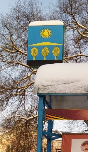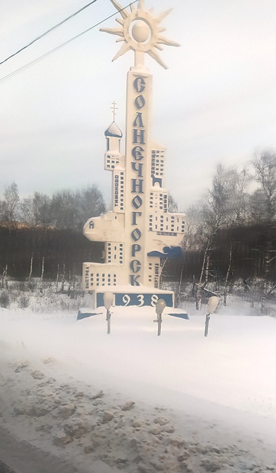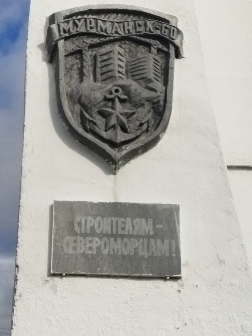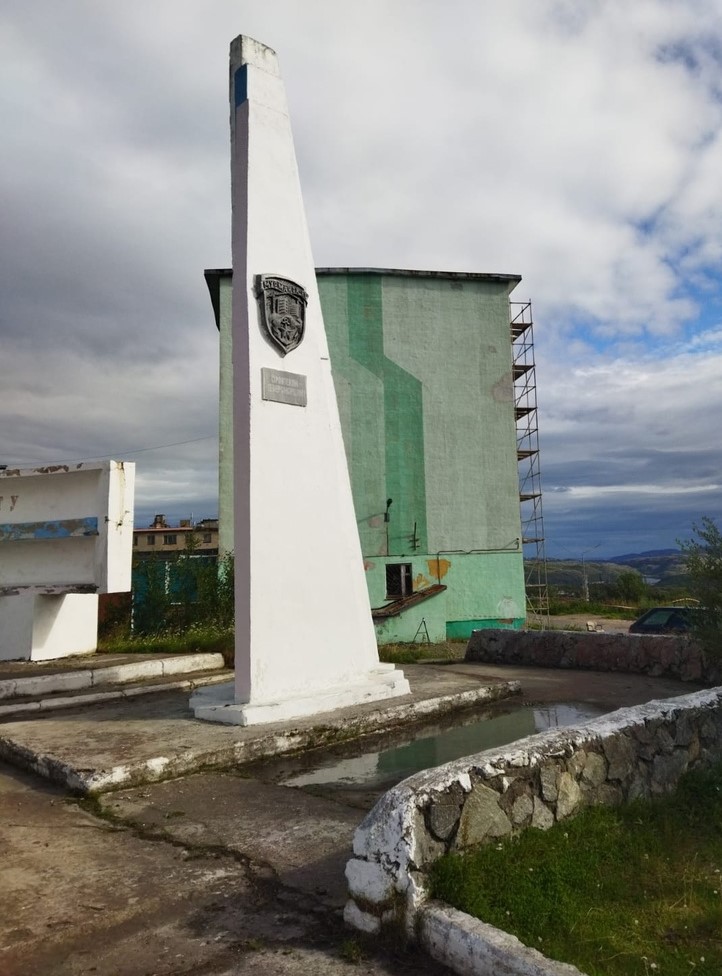 Не дорожный указатель. Просто на въезде в город Снежногорск памятная стела. Сама эмблема интересна