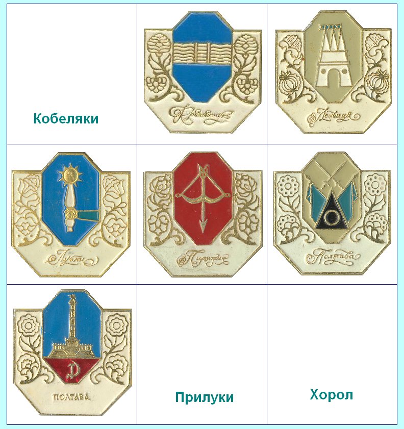 Здесь тоже есть вопрос. По нашим данным есть Гадяч (и знак точно есть). А вот о существовании Прилук ничего не знали. Но по каталогам действительно 9 штук. Еще одна особенность. Кобеляки выпущен меньшего размера (его и покажем).