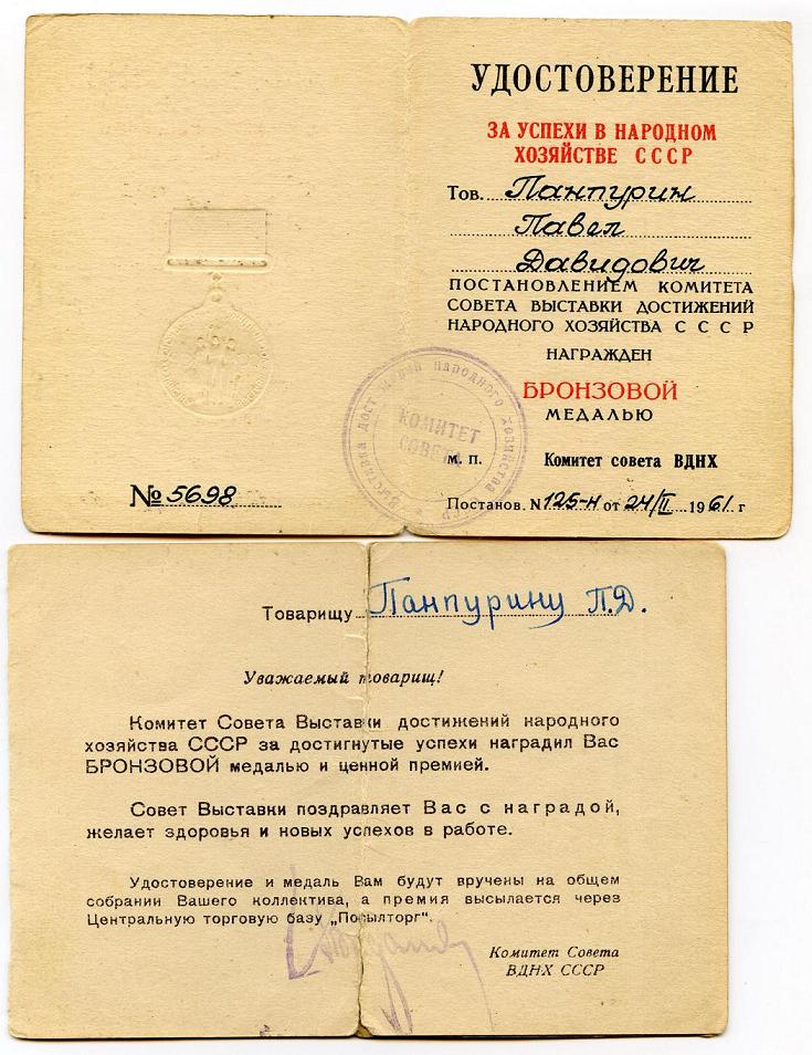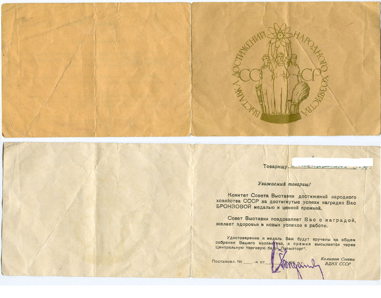 Вот, на мой взгляд, интересный документ-"времянка". Медали "За успехи.." с удостоверением, (в отличии от свидетельства участника) если проследить по документам, вручались как правило в следующем году после проведения выставки.(зимой, в некоторых случаях весной). "Времянка" была подтверждением для трудового коллектива, что участник выставки занял призовое место в номинации. :)