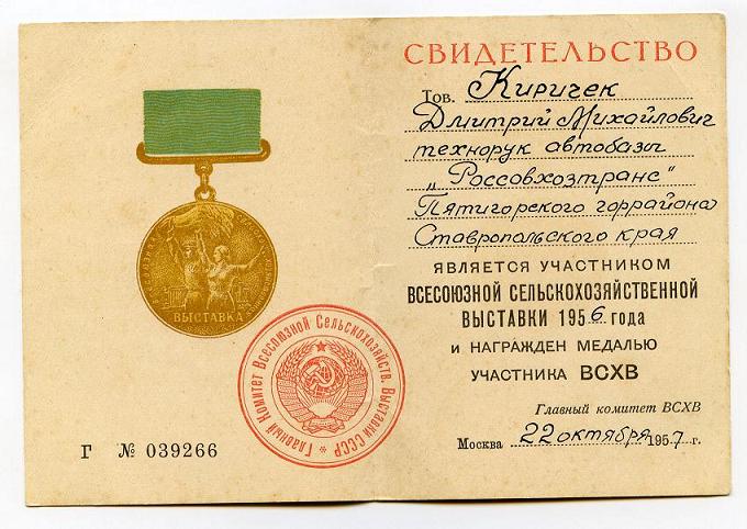 Бланк Свидетельства изготовлен в 1957 году, в выставке Киричек Д.М. принимал участие в 1956 г., свидетельство выписано в 1957 году. Не знаю это ошибка записи или по каким-то причинам вовремя не вручили?