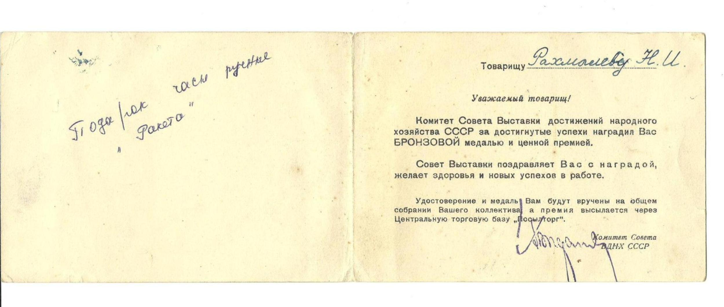 Я так думаю- раз в трудовую книжку записывали премии и всякие поощрения- то и в книжку о награждении(ВДНХ), могли вписать "подарок часы..."