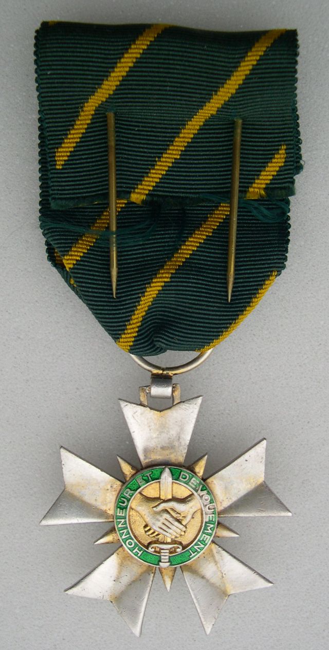 На оборотной стороне: центральный медальон изображал на позолоченной основе две сжатые руки, расположенные над мечом направленном вертикально вверх, окруженный позолоченной надписью HONNEUR ET DEVOUEMENT (ЧЕСТЬ И САМООТВЕРЖЕННОСТЬ) на зеленой эмали.