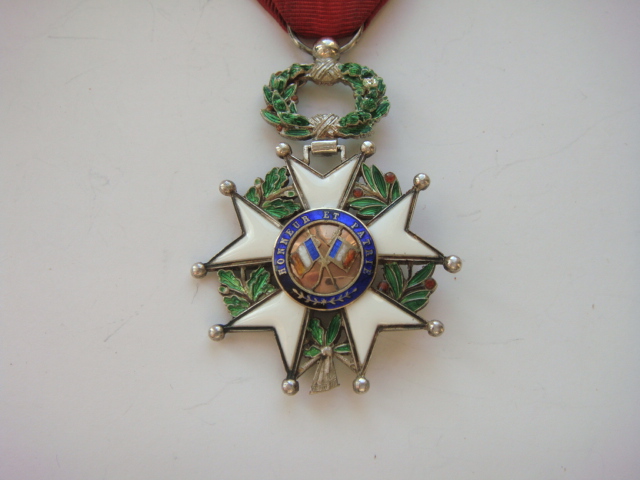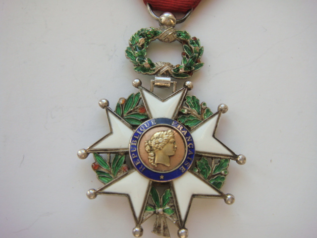 По правде сказать, самыми редкими являются первый тип Первой Империи с паяной короной и тип Второй Империи "сто гвардейцев". Знаки Четвёртой и Пятой Республик встречаются достаточно часто, и некоторые из них просто отвратной работы. Наиболее часто встречается тип Третьей Республики штатной комплектации - серебряная звезда (а отнюдь не крест, как часто пишут) с золотым медальоном, реже - серебряная звезда с серебряным позолоченным медальоном. Это степень Рыцаря. Степень Офицера со времён Третьей Республики встречается как в золоте, так - чаще - в позолоченном серебре; степень Командора - в золоте, позолоченном серебре и в позолоченной бронзе.любитель2 писал(а) :Первый знак, который я выставил пришел с лентой, а на ленте розетка... и венок наборный, из отдельных листьев, но золочения на знаке нет.
