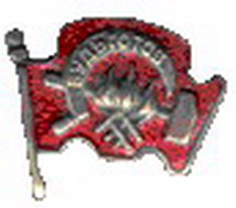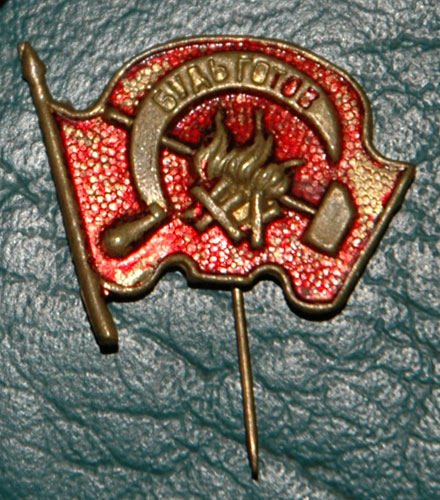 Знак "Будь готов" 1928 г. Знак в форме флажка. В центре знака - изображение горящего костра и скрещенный серп и молот. На серпе надпись: "Будь готов".