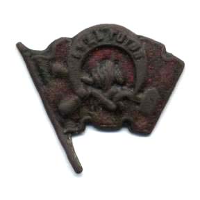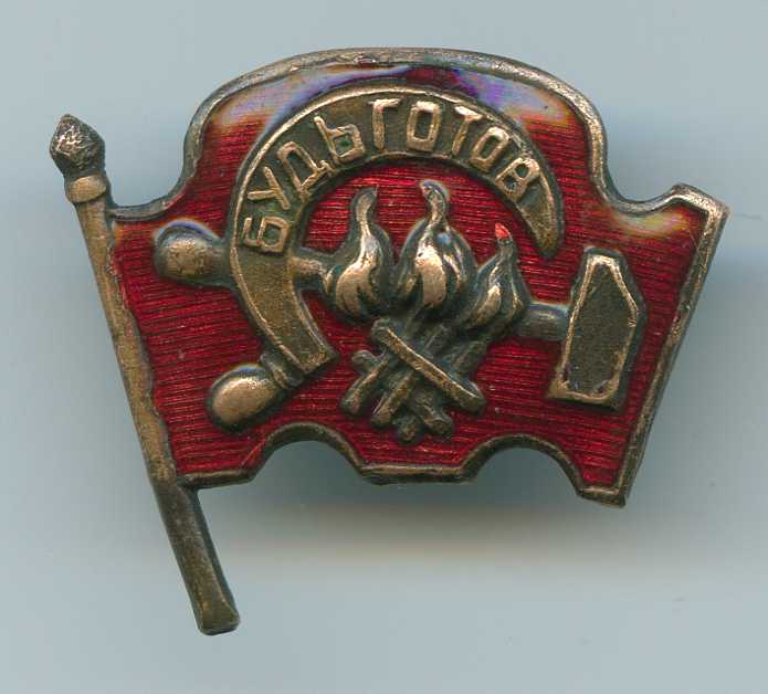 Знак "Будь готов" 1920-е г. Знак в форме флажка. В центре знака - изображение горящего костра и скрещенный серп и молот. На серпе надпись: "Будь готов". В нижней части знака, у древка флажка, изображение пионерского горна и барабана.
