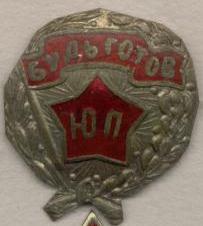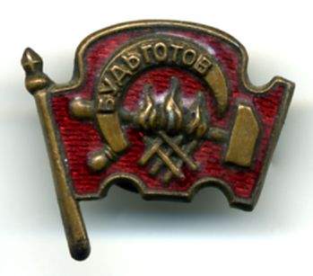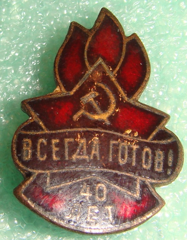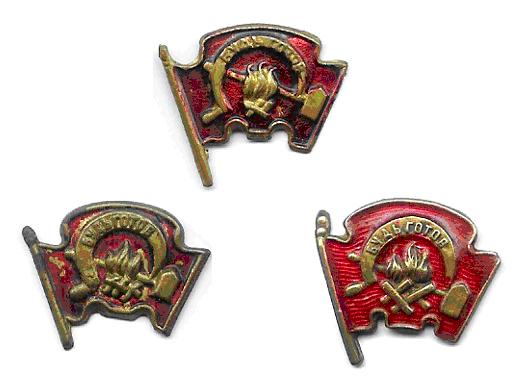 - «Известно, что комсомольцы Замоскворецкого района Москвы в начале 1923 г. (воспользовавшись эскизами пионерских значков, опубликованными в «Памятке юного пионера», составленной В.Зориным) по собственной инициативе изготовили в цехе штамповочного завода на Шабаловке 1000 значков. На значке, имеющем форму знамени, изображены серп и молот, а внутри ? трехпламенный костер на пяти поленьях. На серпе ? надпись «Будь готов!». Цвет значка ? серебристый. Вскоре образец этого значка был утвержден и выпущен массовым тиражом. На знамя была нанесена красная эмаль.