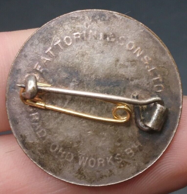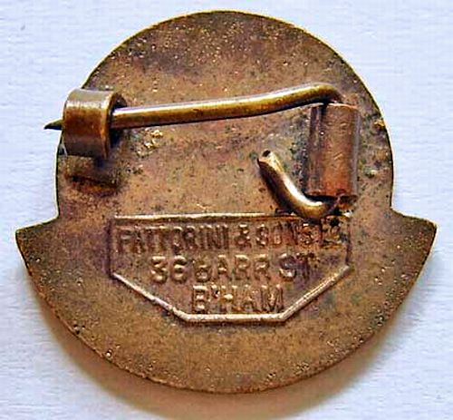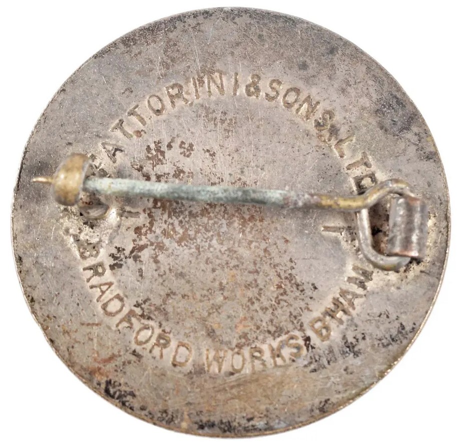 A scarce pre-war circa 1930's 'Young Farmers' Club Wiltshire supporters badge'; silver plated circular example with dark blue enamel horseshoe title, the centre with embossed pair of horses ploughing a field, ploughboy in vintage clothing and sunrise on the horizon; the reverse impressed in relief with 1930's style maker's details "Fattorini & Sons Ltd, Bradford Works B'Ham" in a circular forma... read more