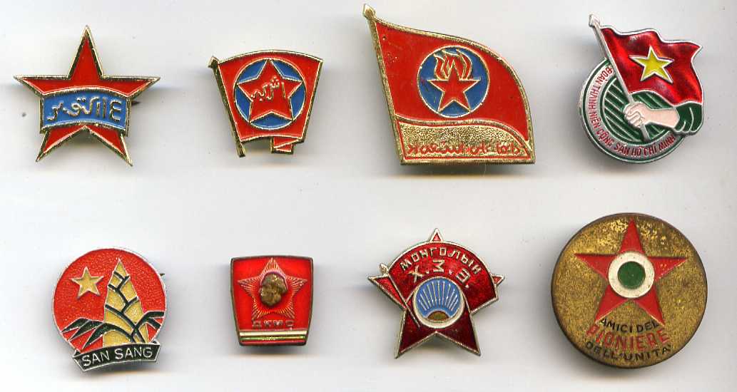 И пионеры, и комсомольцы. Все знаки имеются в темах. Посмотрите пионерию и комсомол Йемена, пионерию и комсомол Вьетнама, комсомол Болгарии, комсомол Монголии. По последниму знаку страну подсказать не могу.