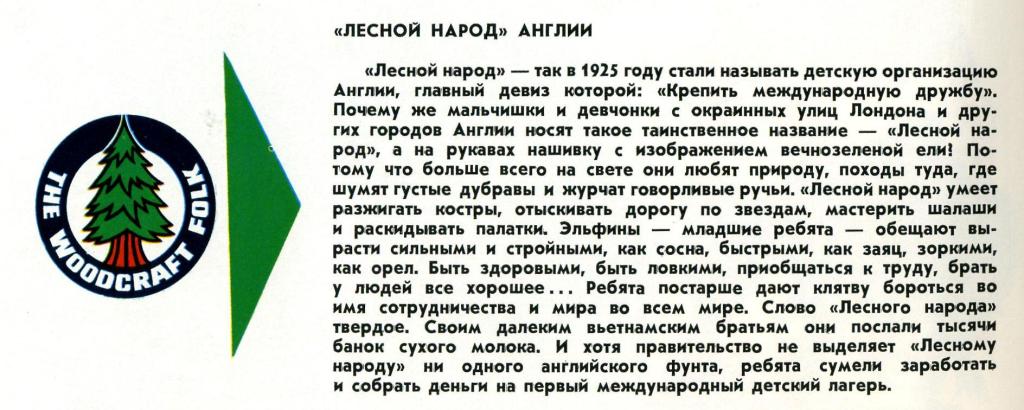 Организация «Лесной народ» создана в 1925 году. Девиз её: «Объединить мир дружбой» [1963: «Крепить международную дружбу»].