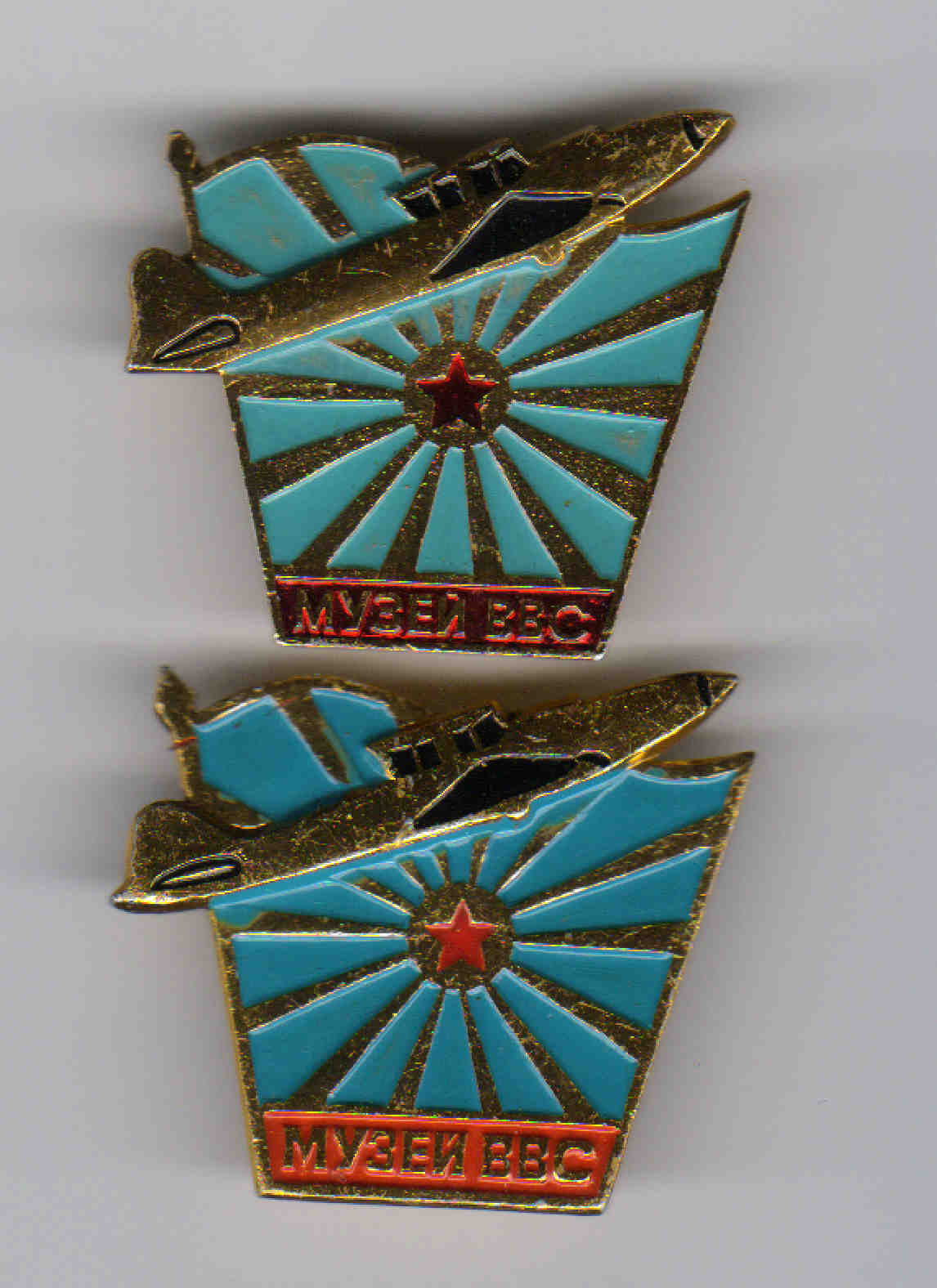 Музей ВВС. Верхний выпущен Мытищинским заводом опытных и сувенирных изделий, а нижний - Московским экспериментальным заводом спортивных сувениров и знаков.