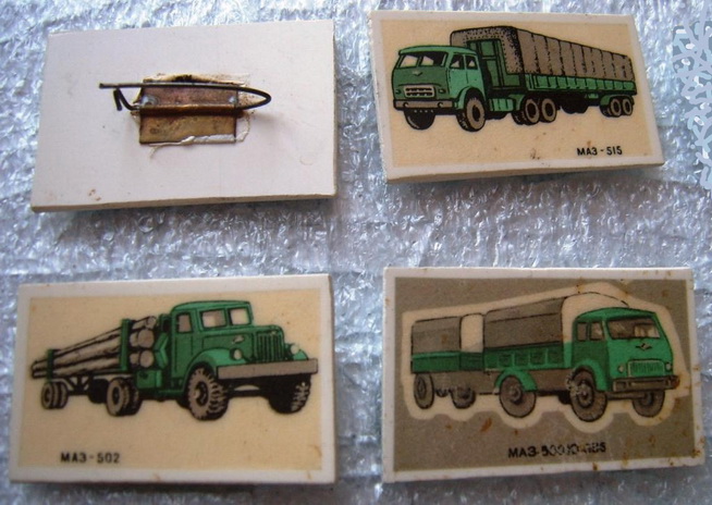 Самоваинная серия значков по МАЗ-у. Комбинация: пластмасса, булавка (не заточенная на остриё) и спичечная этикетка.Radiate13 писал(а) :МАЗ