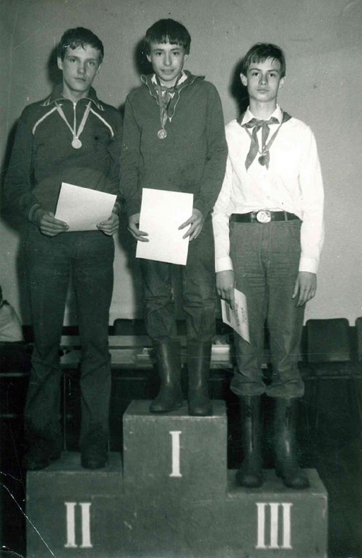 В подтверждение вышесказанного - образец ношения на фото. Это год 1981 или 1982. 1-е место - Владимир Колосов , 2-е - автор этих строк, 3-е - Валерий Мурылев. Все с грамотами, ибо это результаты отрядной спартакиады. На улице ливень, поэтому награждение в клубе, вместо традиционного на общелагерной линейке.