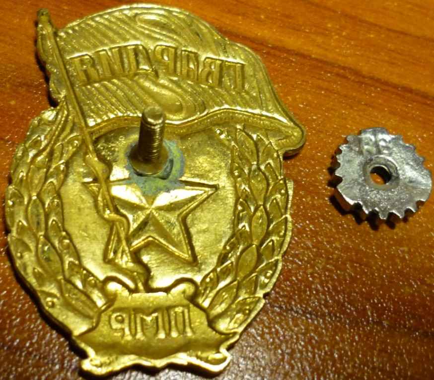 Оборотная сторона знака чистая. При помощи гаечного или булавочного крепления знак носится на военной форме одежды.