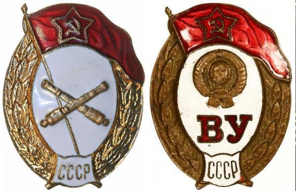 Приказом МО СССР № 213 от 24 декабря 1956 г. были внесены изменения в знак для средних военных училищ, учрежденный в 1950 г. - эмблемы были заменены гербом СССР и буквами "ВУ"
