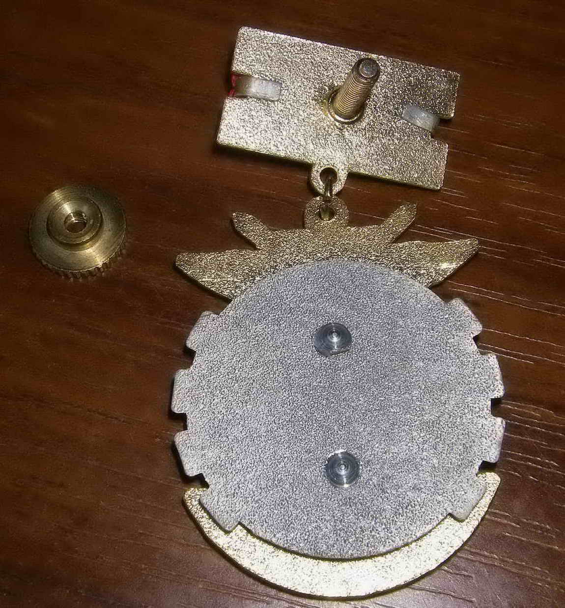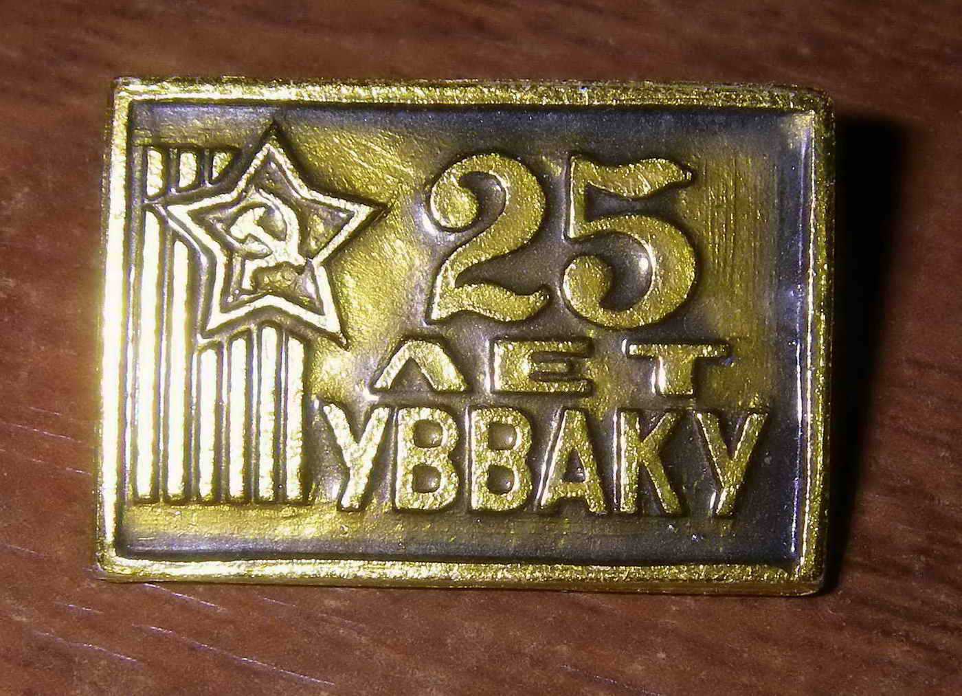Вариант 3. Знак на прямоугольной колодке, покрытой эмалью (краской) цветов государственного флага РФ. Поверх эмали наложена золотая звезда. Сзади на колодке имеется винт.