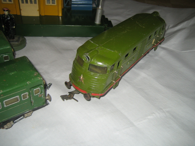 Имеется полный комплект, в хорошем состоянии, в родной деревянной заводской коробке. Игрушечная железная дорога выпускалась московским заводом «Прожектор» на шоссе Энтузиастов и была одной из самых сложных и дорогих электромеханических игрушек конца 50-х годов. Игрушка стала поступать в продажу примерно с 1955 года и продержалась около 15 лет. До 1961 года она стоила 360 руб., после хрущевской денежной реформы – 36 руб., но и в том, и в другом случае вожделенная мечта многих городских мальчишек – а продавалась дорога только в крупнейших универмагах СССР, таких как «Детский мир» или «Дом игрушек» - была недоступна. Чаще дорогу покупали бюджетные организации детского творчества – дома, клубы и кружки юных техников.