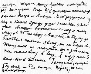"3 ноября. Вторник. Пишу, вероятно, в последний раз. Замерзаю. Вчера, 2 ноября, произошла катастрофа: погибли Костя и Алеша. Плот задернуло под лед, и Костя сразу ушел вместе с плотом. Алеша выскочил на лед и полз метров 25 по льду с водой. К берегу пробиться помог я ему, но на берег вытащить не мог, так он и закоченел наполовину в воде. Я иду пешком. Очень тяжело. Голодный, мокрый, без огня и пищи. Вероятно, скоро замерзну"