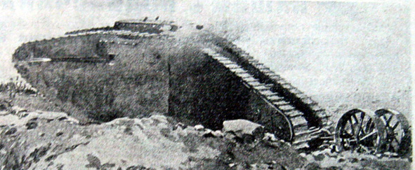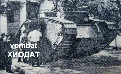 В «Ниве» были недавно помещены изображение изобретенного английскими военными инженерами гигантского бронированная автомобиля. Бесстрашный и неуязвимый, устремляется он всей своей громадой в самую кипень боя, под снаряды и пули, свободно берет вражьи окопы, как пустое, незначащее препятствие, и, посеяв вокруг себя разрушение и смерть, преспокойно возвращается в свой полк. Английские солдаты назвали этого своего нового боевого товарища «лоханью» (“tank"—„тэнк”).