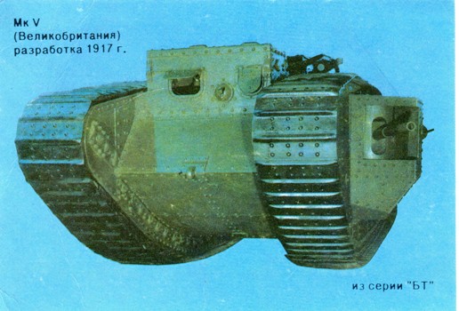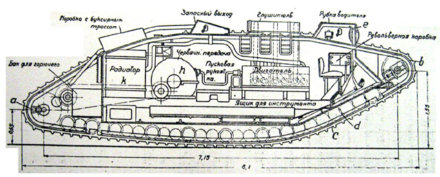 «Первым английским серийным танком был Mk I. Он весил 28 т (27 т — «самка»), имел скорость 4,5 км/ч, запас хода 19 км и броню толщиной 5—11 мм. Вооружение: 2— 57-мм пушки и 3 пулемета («самец») или 5 пулеметов («самка»). Экипаж состоял из 8 человек. Двигателем служил бензиновый мотор Даймлера. Трансмиссия состояла из двухскоростной коробки передач (КП), червячного редуктора и дифференциала, на выходных валах которого стояли две дополнительные бортовые коробки передач. Отсюда цепная передача открыто шла на расположенные сзади ведущие колеса. В движении она часто забивалась грязью. Управление танком требовало усилий четырех человек: водителя, командира (работавшего тормозами гусениц левого и правого борта) и двух трансмиссионщиков, работавших на бортовых коробках передач. Водитель голосом или рукой подавал им нужные команды. Поворот с малым радиусом осуществлялся или торможением одной гусеницы, или переключением бортовой КП одного борга в нейтральное положение и включением передачи другого борта.