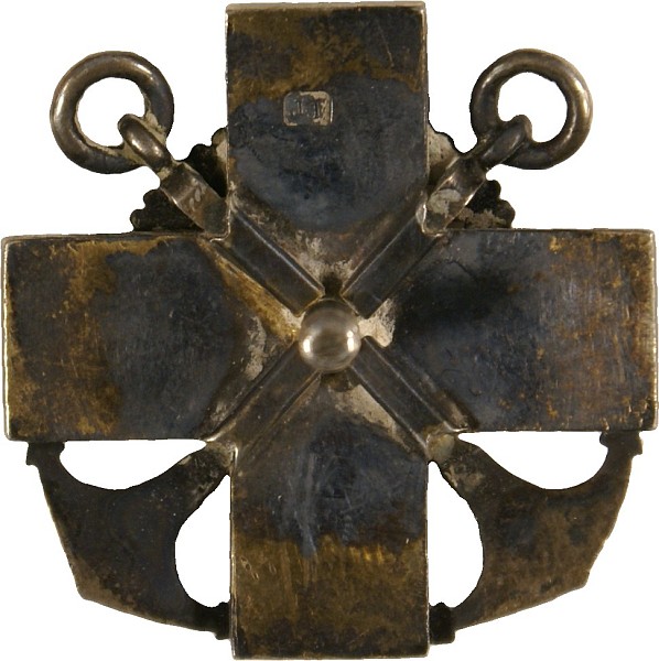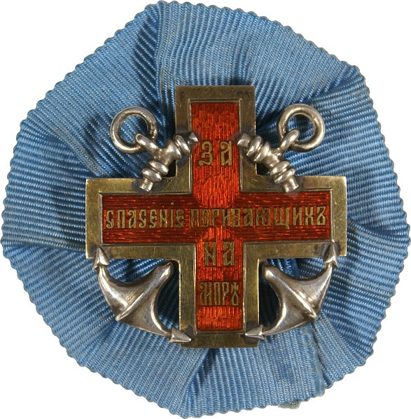 13 марта 1872г были утверждены знаки общества спасения погибащих. В основе знака прямой греческий крест, покрытый эмалью красного цвета. По эмали проходит надпись, выполненная славянскими буквами: За спасение погибающих на море. Между лучами проходят два скрещенных якоря. Знак носился на розетке из Андреевской ленты."...