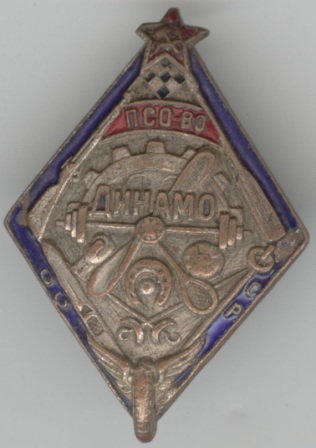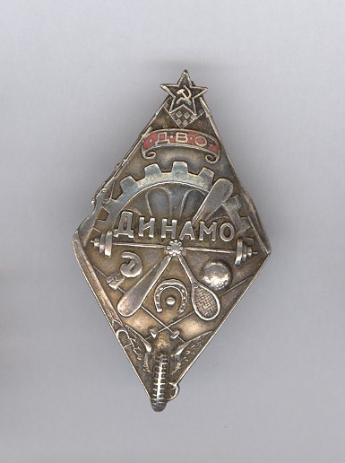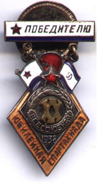 На знаке: ПОБЕДИТЕЛЮ СПАРТАКИАДЫ ДИНАМО 1938, на левом фрагменте флагов,-