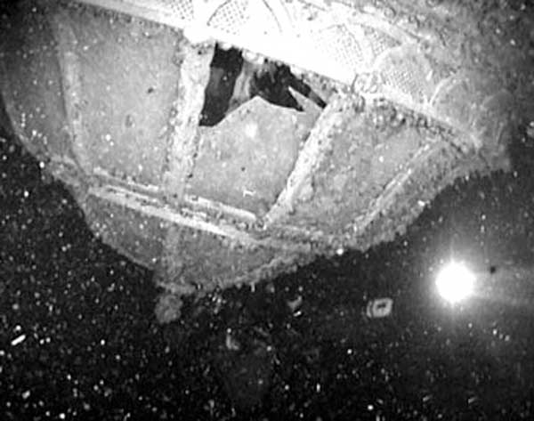 С трудом в перевёрнутом корпусе угадывается огромный корабль. От носа и до середины большие разрушения от взрыва торпед. :ded: