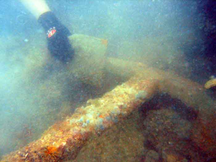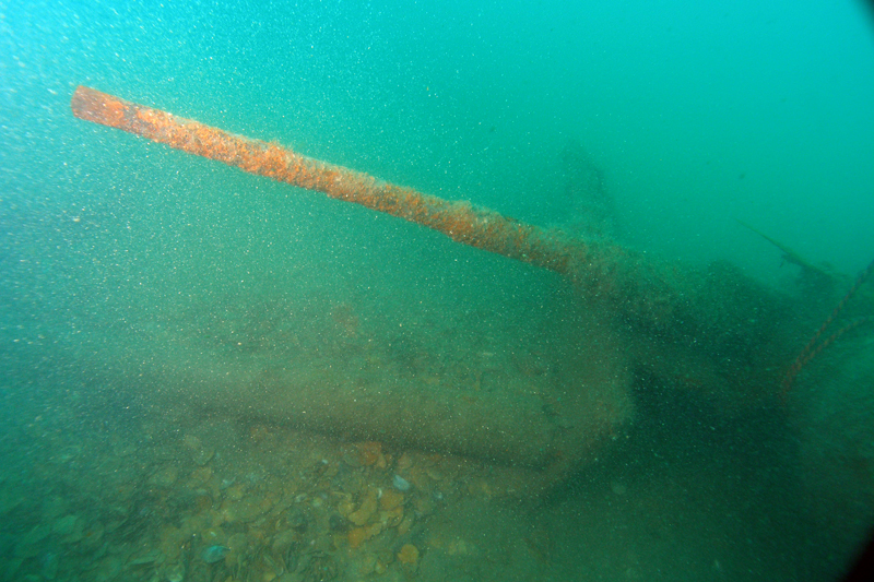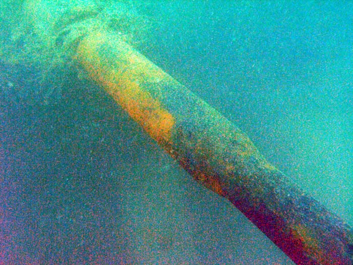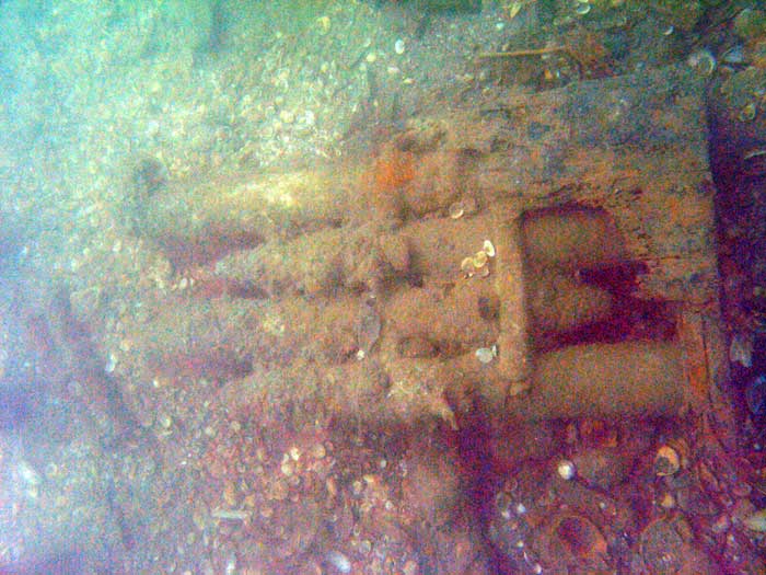 Уже на следующий день, в 3-х км от берега на глубине 10 м был обнаружен искомый объект. Надстройки не сохранились. В проломе корпуса просматривается машинное отделение и двигатель. Рядом, зарывшись в грунт, лежит крупнокалиберный пулемёт на станине и два якоря, а также 20-мм пушка, принадлежность которой долго ещё будет загадкой. :ded:
