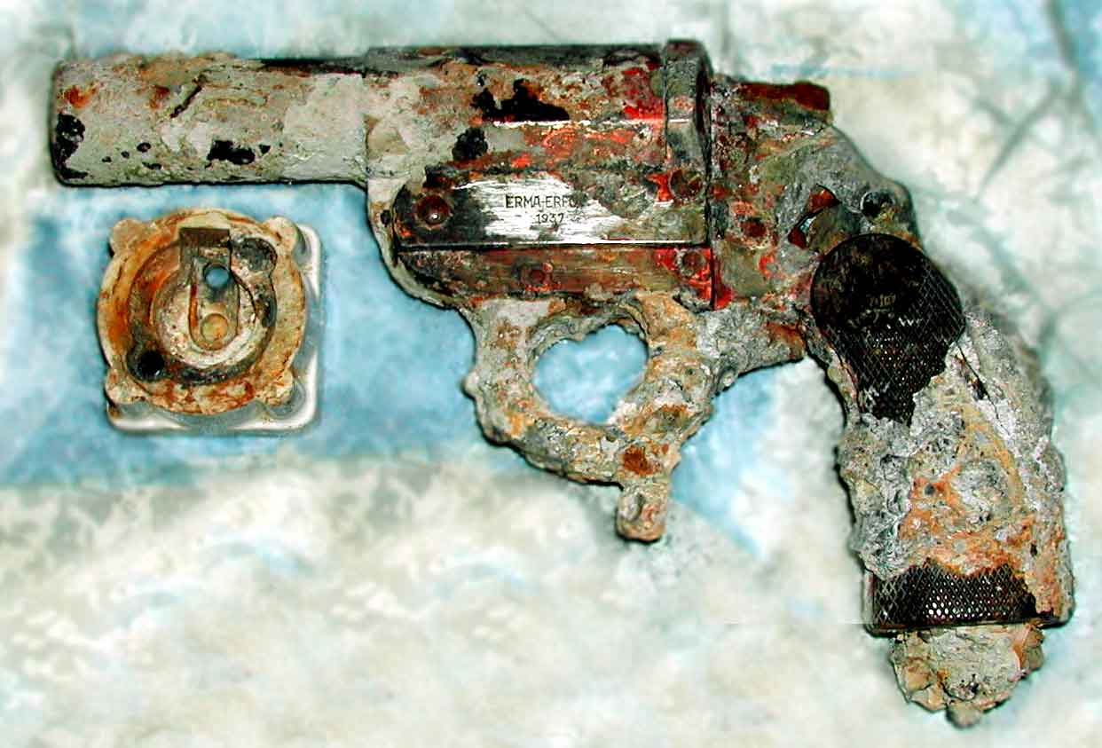 Экспедиция уже подходила к концу, но последний день принёс ещё одну загадку. В нескольких метрах от останков корабля была найдена ракетница, явно немецкого происхождения, судя по названию фирмы на бирке. Завод "Эрма" в Эрфурте выпускал в годы WW2 оружие для вермахта. :diver: