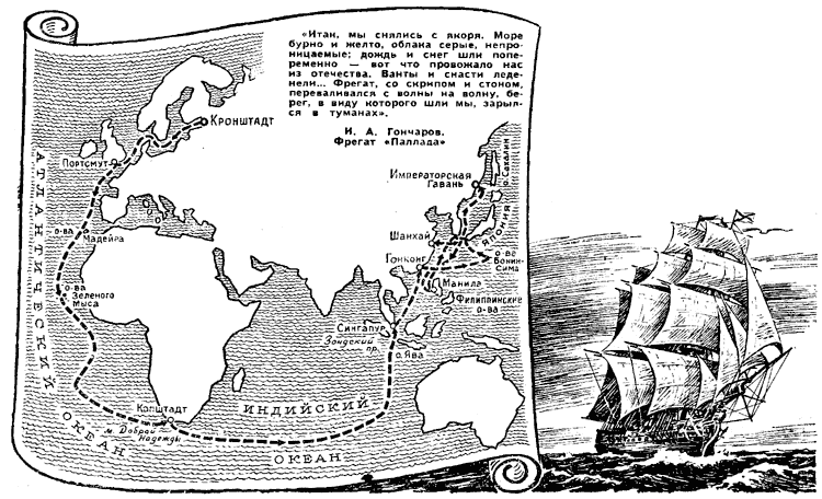В 1852 г эскадра отошла с Кронштадтского рейда курсом, через Балтику и Северное море, в Атлантический океан. Затем обойдя Европу и Африку,пройдя неспокойные воды в акватории м.Доброй Надежды, 44-пушечный российский корабль в составе эскадры, вошёл в тёплые воды Индийского океана.