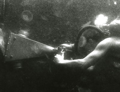 ... И снова, очередное погружение в холодное и неприветливое море. Уже на 8-метровой глубине, на заваленном, в полном смысле слова, всяким мусором дне, на глаза случайно попался большой зеленовато-серый металлический лист, с рядами отверстий по периметру. Стоп! Отверстия прямоугольной формы. В некоторых, ещё торчат кованные гвозди. Это, явно, не обивка современного атомохода.
