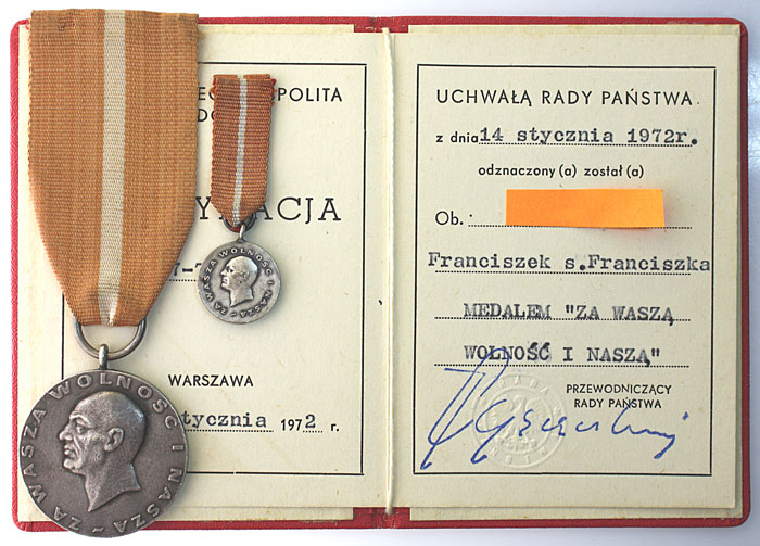 Medal Za Wolność Naszą i Waszą- Také nesl název polského vojenského dekorace, poskytnuté účastníci pěšky (na republikánské straně) ve španělské občanské válce.mikulas писал(а) :Za Vasce i nasce Wolnoscc польски написано-3а Вашу и Нашу Свободу.Не думаю,что серебро.С таким девизом уже всречался,на какой-то награде,медали,но не помню ,где...