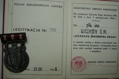 Спасибо за исчерпывающий ответ!olinis писал(а) :Медаль "Братство по оружию" (Odznaka Braterstwa Broni) учреждена Решением Правительства ПНР от 7 октября 1963 года. Первый вариант.