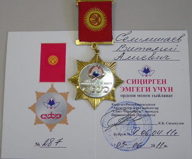 Разъяснения azza - "Перевод названия ордена Сиңерген – заслуженный, усердный, Эмгеги - труд, Yчүн - за.yusom писал(а) :Орден Союза Чернобыль Киргизии к 25летию аварии на ЧАЭС ( может быть, кто-нибудь из знающих язык переведет, как он называется)...