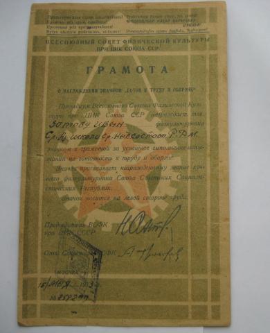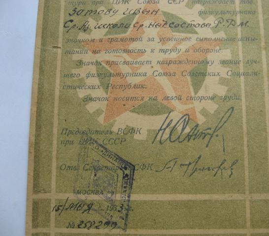 1933 ГОД-ГРАМОТА О НАГРАЖДЕНИИ ЗНАЧКОМ-