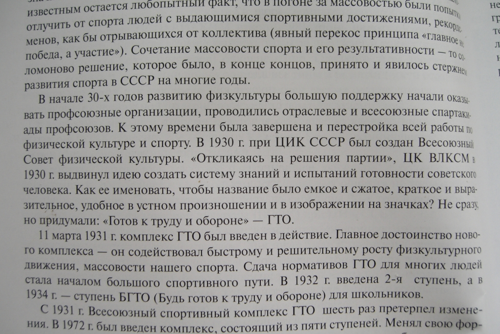 Физкультурный комплекс ГТО ("Готов к труду и обороне СССР"), всесоюзный физкультурный комплекс, составляющий основу государственной системы физического воспитания и направленный на укрепление здоровья, всестороннее физическое развитие сов. людей, подготовку их к трудовой деятельности и защите Родины. Является основой программ по физическому воспитанию во всех учебных заведениях и спортивных секциях. В комплекс входят гимнастические упражнения, бег (на короткие и средние дистанции), прыжки (в длину или высоту), метание (диска, копья, толкание ядра и др.), плавание, лыжные гонки (для бесснежных районов - марш-бросок или велогонки), стрельба (только для юношей). Введён в 1931 по инициативе ВЛКСМ; в 1932 дополнен 2-й ступенью и в 1934 - ступенью "Будь готов к труду и обороне" (БГТО). 1-я ступень ГТО рассчитана на девушек и юношей 16-18 лет; 2-я - на взрослых (19 лет и старше). Ступень БГТО - на девочек и мальчиков 14-15 лет. С 1966 введена специальная ступень комплекса - "Готов к защите Родины". В комплекс периодически вносились изменения в соответствии с задачами советской системы физического воспитания.
