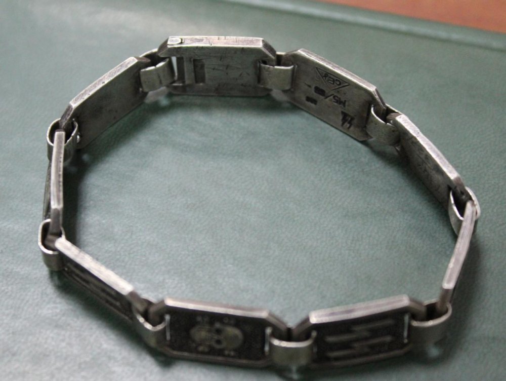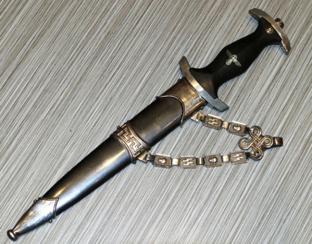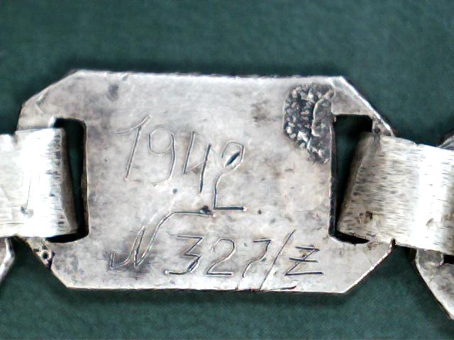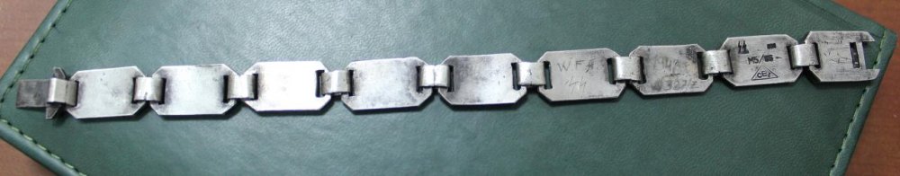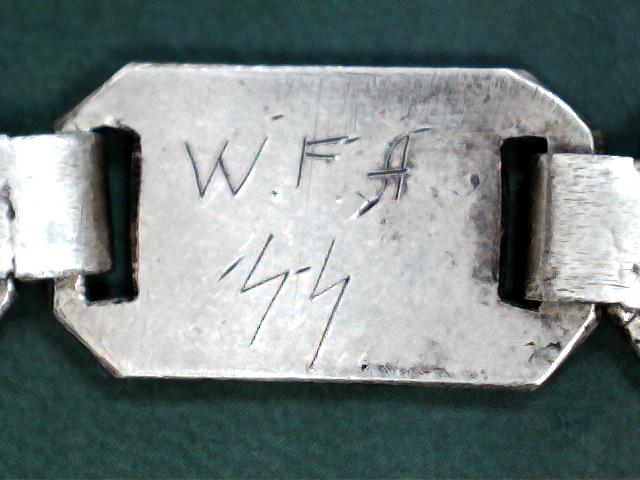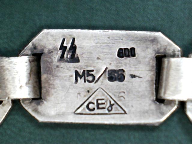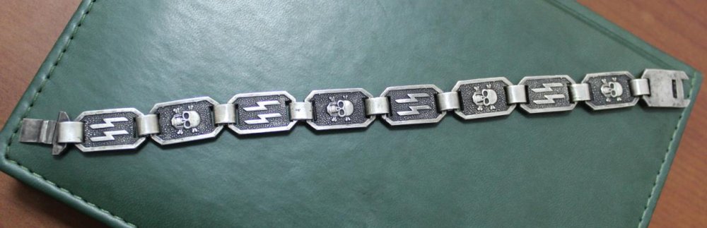 У моего друга более 20 лет находиться в коллекции вот такой браслет, купил он его в Калининграде в начале 90-х годов. До сихпор информации по нему не можем найти. Браслет похож на подвесную цепочку кинжала СС Лидер, только на кинжале 6 звеньев, а на этом браслете 8, а 9 звено сделано замком. На браслете стоит 800 проба серебра ( это наше предположение, что цифра 800 обозначает пробу), 800 проба ставилась на серебре до 1945 года. Если предположить, что браслет сделан из цепочек 2-х кинжалов, то получается маленькая не стыковка, цепь на кинжал делали из стали и мельхиора, а серебро слишком мягкий метал для подвески. Возможно этот браслет наградной, вручался за особые заслуги, возможно он был сделан на заказ кому то в подарок. На первом звене от замка стоят заводские клейма, может по ним что то проясниться (частная мастерская или завод). Если кто либо встречал подобную вещь, или имеет информацию, просьба поделиться.