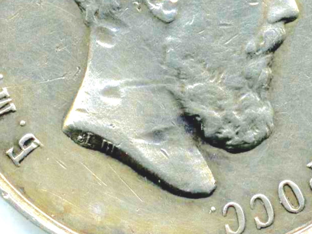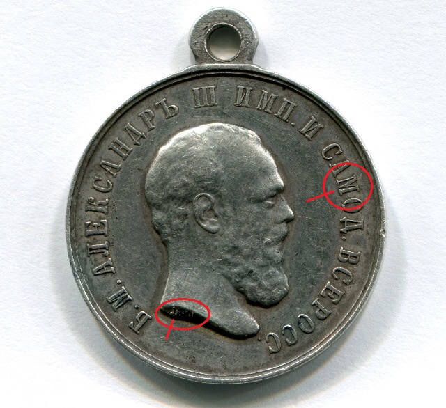 Но вернёмся к медали т.с на ней есть очевидные " родовые пятна" присущие данной партии фуфла - сдвиг к правой ножке в букве М в слове Самодержец и характерная монограмма Л. Ш в обрезе шеи Императора , где буква Л больше похожа на букву П. ( на фото медали Добрый 78 отметил красным)