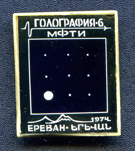 Значок Пятой всесоюзной школы по голографии, организаторами которой выступили МФТИ, Институт Автоматики и Электрометрии СО АН СССР и НГУ. Школа проходила с 29 января по 3 февраля 1973 года в Академгородке, вблизи г. Новосибирска.