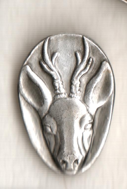 Кабан. Значок с редкой технологией изготовления. Подложка, на которой закреплена булавка, изготовлена из тонкой нержавейки 0,3 мм с поднятыми на 2 мм краями. Внутрь этой ложечки вклеена медная головка кабана, по видимому, на эпоксидной смоле.