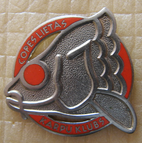 Если не ошибаюсь, то нижний значок выпущен латвийским журналом для рыбаков "Рыболовные дела". Клуб, наверное, любителей ловить карпов. :)