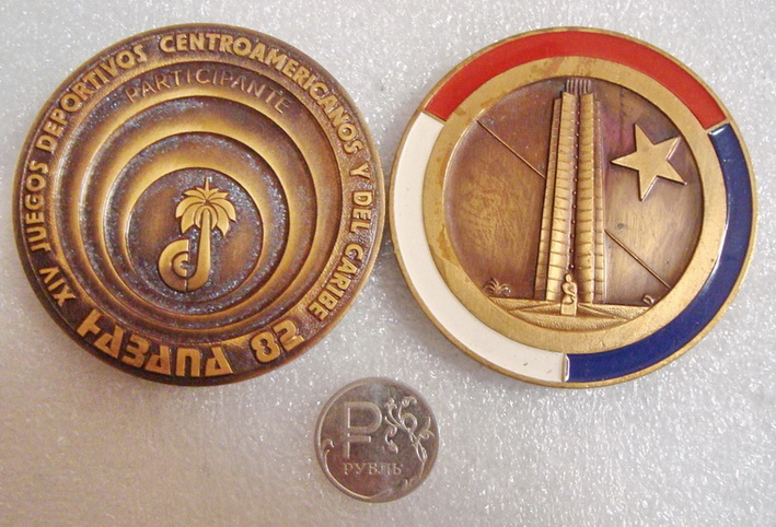 1. Настольная медаль - XIV Центральноамериканские и Карибские игры Гавана 82. Участник. XIV juegos deportivos centroamericanos y del caribe Habana 82. Participante. Материал:тяжмет, краска. Состояние на фото. вес больше 100 гр.
