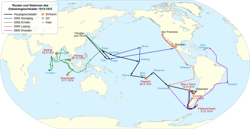 20 июня Шпее уходит с крейсерами «Шарнхорст» и «Гейзенау» на юг до Самоа. Перед отплытием адмирал вызвал к себе командира крейсера «Эмден» капитана 2 ранга Мюллера и приказал ему иметь при себе 3х месячный запас угля и провизии и находиться в готовности к выходу в море по получении приказа. 28 июня поступает сообщение об убийстве в Сараево наследника австрийского престола и его супруги. Далее события развиваются стремительно. 5 июля Германия обещает поддержку Австро-Венгрии. 23 июля Австро-Венгрия предъявляет ультиматум Сербии. 25 июля Сербия обращается за помощью к России. 26 июля Австро-Венгрия объявляет о мобилизации и сосредотачивает войска на границе с Россией. 28 июля Австро-Венгрия объявляет войну Сербии. 1 АВГУСТА ГЕРМАНИЯ ОБЪЯВЛЯЕТ ВОЙНУ РОССИИ (начало Первой войны). 2августа Германия объявляет войну Франции. 4 августа Великобритания объявляет войну Германии. 6 августа Австро-Венгрия объявляет войну России. Тем временем, мировые события вносят свои коррективы и на ход событий в Циндао. Крейсер «Нюрнберг» отзывается из вод западного побережья Америки. 8 июля официально отменен переход крейсера «Эмден» в Шанхай в качестве стационера. Попытка связаться с адмиралом Шпее заканчивается ни чем. Приказа о мобилизации флота нет. Отсутствие в Циндао адмирала Шпее и командиров крейсеров «Шарнхорст» и «Гейзенау» создает определенную неопределенность в статусе капитана 2 ранга фон Мюллера. По формальным основаниям он становиться старшим немецким офицером в этом важном и обширном районе с соответствующими полномочиями и ответственностью. 30 июля, не получая никаких приказов, Мюллер своей властью объявляет на «Эмдене» мобилизационную готовность. Он понимает, что с началом войны Циндао в лучшем случаи будет заблокирован, а в худшем захвачен противником. С потерей Циндао будет потерян и источник снабжения углем. После выполнения всех мобилизационных мероприятий и приведения крейсера в полную боевую готовность крейсер выходит в открытое море курсом на север к цусимскому проливу. В ночь на 3 августа обнаруживает судно, преследует его и, открыв огонь на поражение, вынуждает его остановиться. Далее по отработанной схеме: высадка призовой команды, захват радиорубки, осмотр корабля, изучение документов, принуждение экипажа следовать назначенным курсом. Устанавливается, что задержанное судно «Рязань» принадлежит русскому Добровольному флоту и следует без груза из Нагасаки во Владивосток, имея на борту 80 пассажиров. Пароход «Рязань» стал первым призом немецкого флота, захваченным в открытом море в ходе начавшейся мировой войны. Призовой суд Циндао конфисковал «Рязань» по законам военного времени. Позже он был переоборудован в вспомогательный крейсер и переименован в «Корморан». Команда и пассажиры «Рязани» позднее были отправлены во Владивосток по железной дороге. Тем временем адмирал Шпее, продолжает находиться в плавании с основными силами эскадры в южной части Тихого океана. Поражает прозорливость адмирала. Уже в начале июня он понимает, что развивающие события в далекой Европе стремительно ведут мир к войне. Фон Шпее, как ни кто другой, понимает, что существует реальная угроза уничтожения эскадры превосходящими силами стран союзников. Он считает, что вступление в войну Японии является лишь вопросом времени. Циндао будет зах