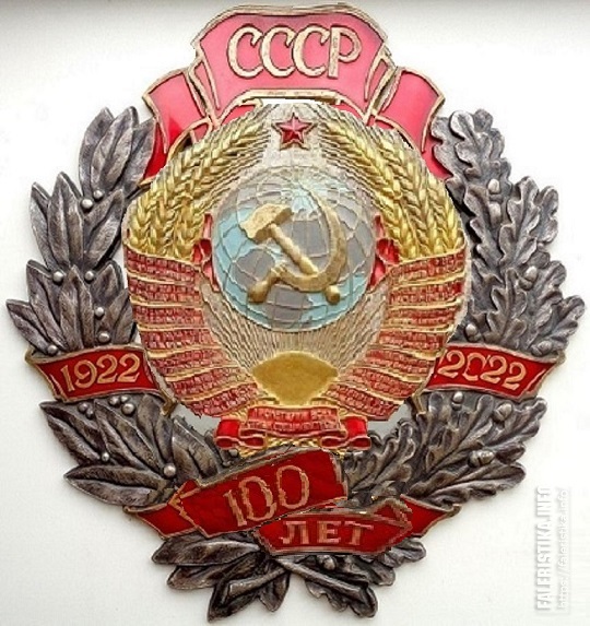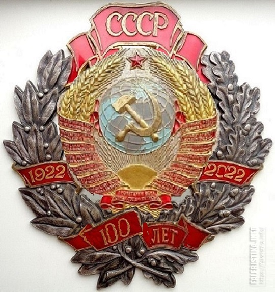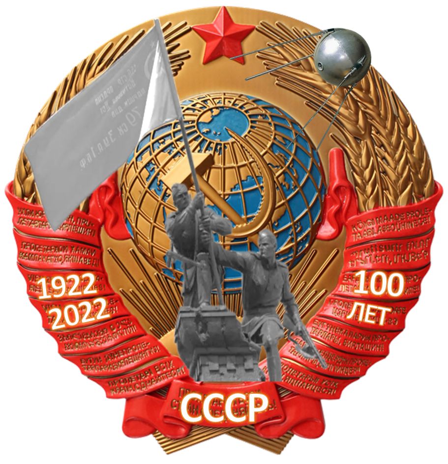 Что-то типа вот такVVK писал(а) Чт, 11 ноя 2021 13:52:39: ↑ Думаю смотрелось бы лучше без подложки герба, тем более, если он будет накладной; буквы СССР сделать крупнее, а ленту под ним пошире. Надпись 100 лет тоже покрупнее, иначе она теряется на фоне дат 1922, 2022. Тогда низ и верх знака будут уравновешены и создадут вертикальную ось.
