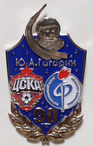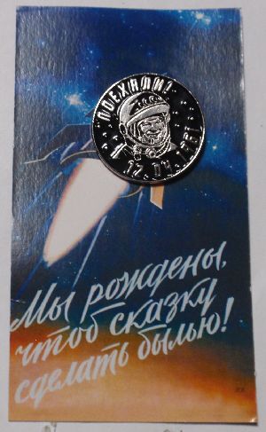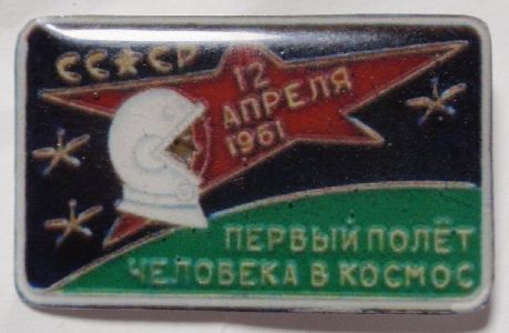 Круг диаметром 17 мм. В верхней части размещены красный флаг с надписью «СССР» и космическим кораблем. Ниже изображен шар, опоясанный орбитой. Остальное поле значка представляет собой звездное небо. В нижней части расположена плашка с датой: «12.4.1961». Красная и голубая эмаль. Томп. Бул.
