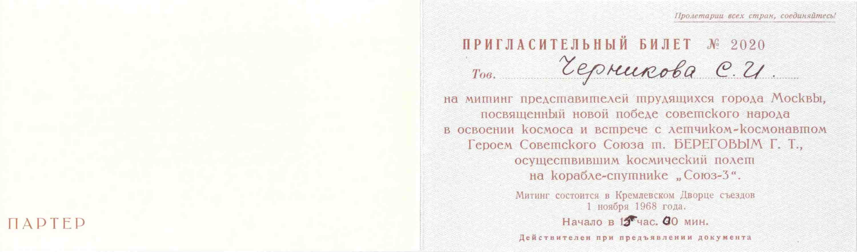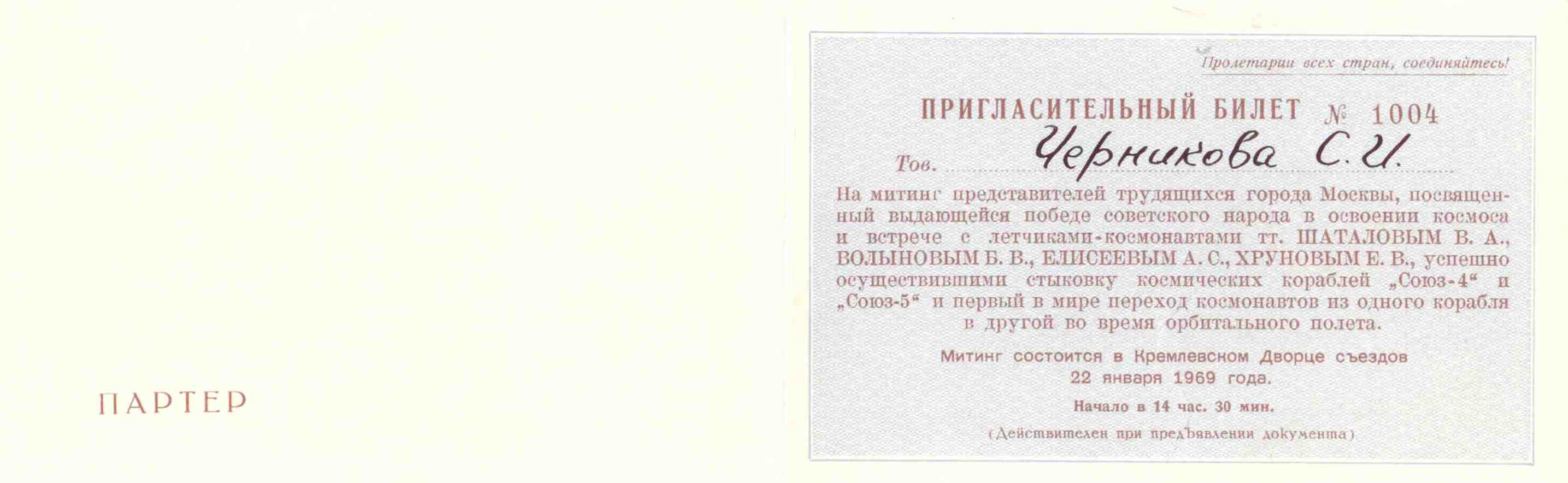 Пригласительный билет на встречу с экипажами космических кораблей "Союз-4" и "Союз-5".